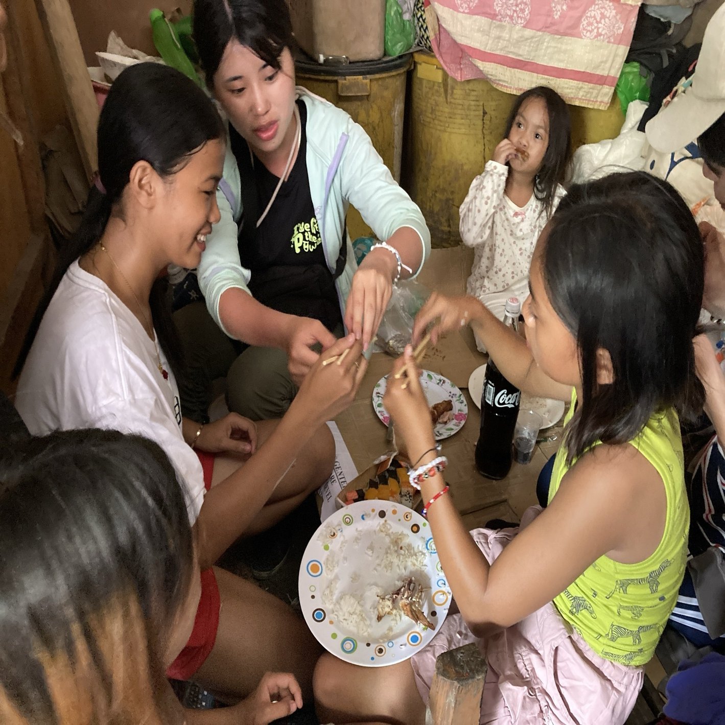 現地ボランティアの家で、狭い空間にみんなで集って、ダンボールを敷いて、ごはんタイム。